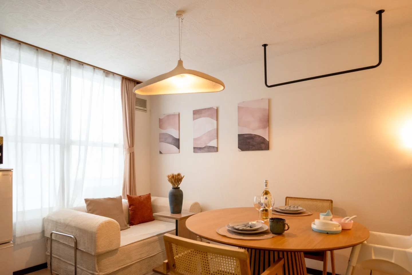 思いきりくつろげるソファーがおすすめポイント。思わずここで寝てしまうかもしれません。 ラタン調の今風な椅子も取り入れた、居心地のよいおしゃれなお部屋です。